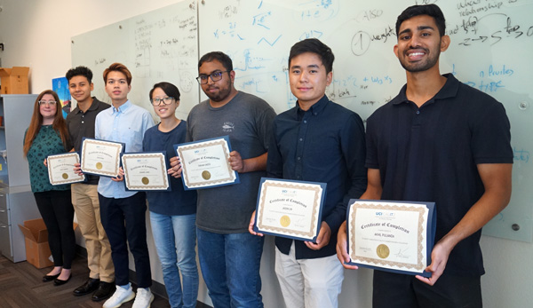 (L to R) Chelsea Choudhary, CALIT2 Summer Research project manager, stands with summer research students Christopher Ramirez, John Pham, Jeannie Liang, Farhan Saeed, Jason Lin and Akhil Pulianda.